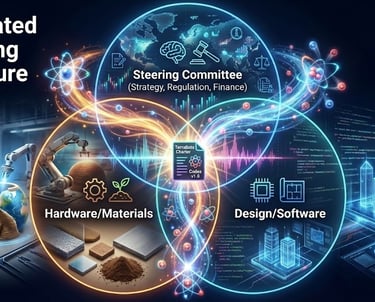 Genesis is structured as an integrated ecosystem. A central Steering Committee aligns strategy, regulation, and finance, guiding two focused technical circles: Hardware/Materials and Design/Software. This structure ensures that the field's engineering foundation is not just technically sound, but also regulatorily viable and market-ready.