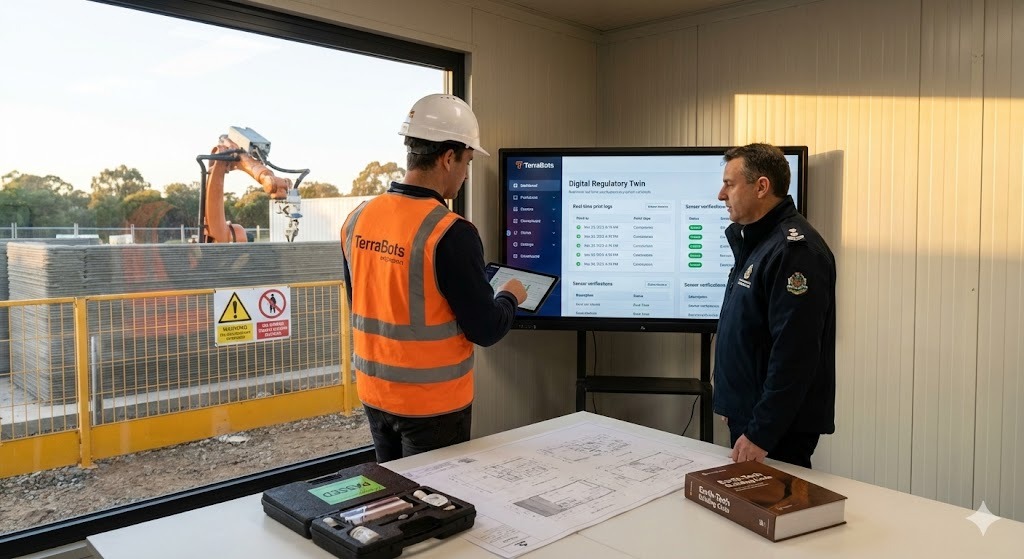 A continuously updated compliance record combining the as-designed BIM model with real-time construction data, material certification logs, robotic print history, and sensor feedback documenting every step of fabrication.